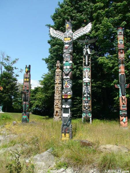 Stanley Park, Vancouver, British Columbia, Canada. Coal Harbour, Totem poles, Harry Winston Jerome statue, Prospect Point, the Hollow tree, and the Lions Gate Bridge are shown above.